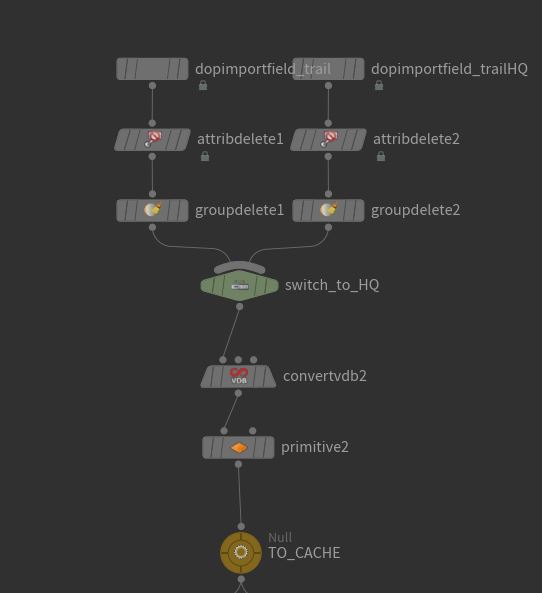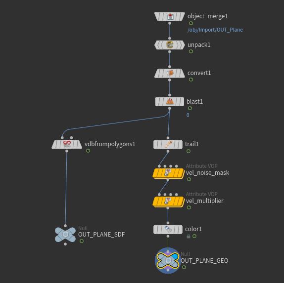 I set up the smoke trail source by taking the tail part of the plane, cut it, and made a pyro source out of it. The velocity was transferred from the animation back to the points and added a multiplier. I rasterized density, velocity, and temperature separately to control them better. In smoke import bucket, I optimized file size for caching by turning the sim into vdb and writting out 16-bits with.