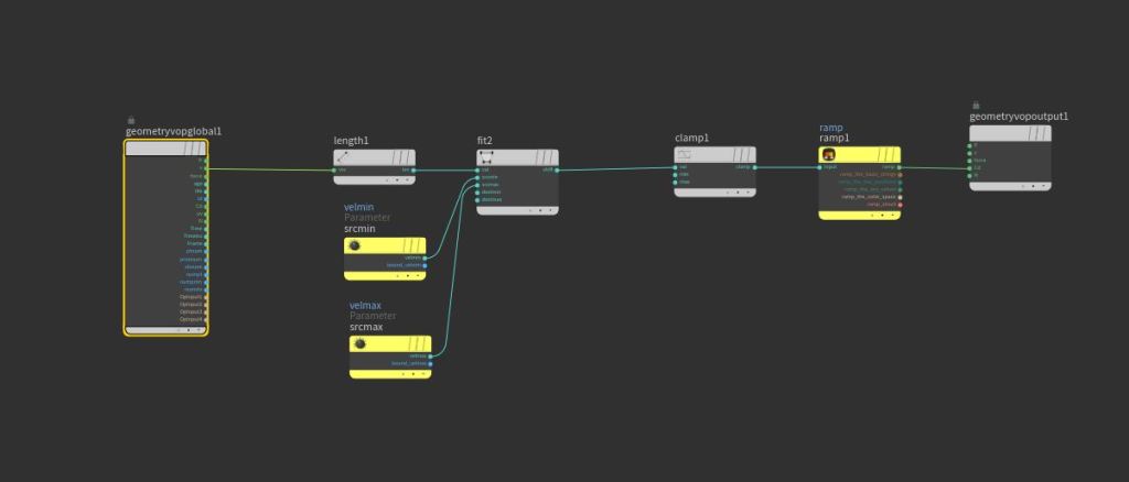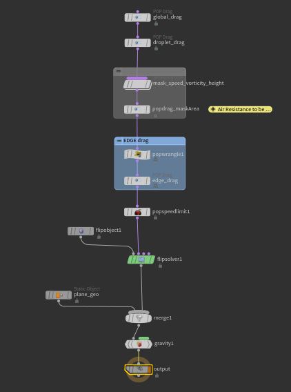 Over the past week, I’ve updated my setup for the fluid simulation. Compared to the initial setup, I added velocity control for the plane (collision object), global drag, droplet drag, and speed limit. I also enabled “Vorticity”, for which in order to correctly view velocity and vorticity together after caching, I applied the velocity/vorticity display Attribute VOP that I learnt from Igor Zanic.