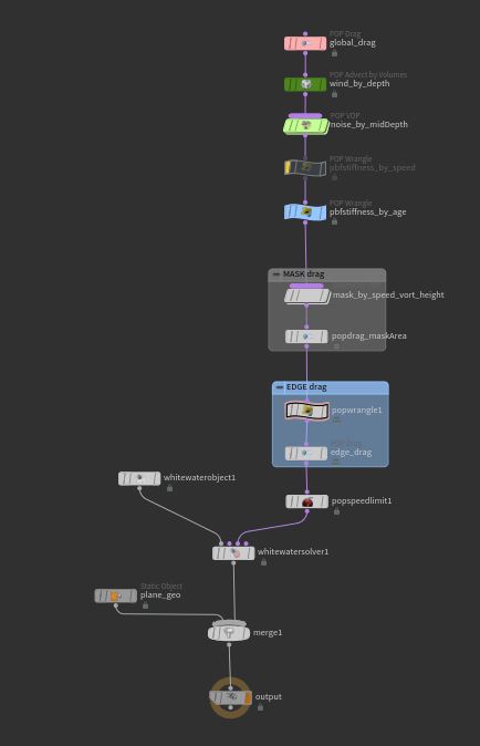 Last LOG, I tested out different sources for the whitewater simulation. For this one, the simulation dopnet was set up with global drag, drag by masks, some noise based on height, edge drag for the sim domain, and pbfstiffness on the particles. Then an external whitewater force (curl noise) was added. Afterwards, when importing the sim back into object level, I made an Attribute VOP for whitewater preview based on its velocity.