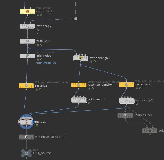 For the trail simulation, I added some microsolvers including disturbance, turbulence, dissipation. Before I started doing any wedges, I let the sim run without microsolvers to see any problems. There was, apparently, some stepping in the scene as the source was instantiated. So, velocity blur was introduced in the volume rasterize node. Yes, that helped decrease the stepping, but there were still chunks of mushroom smoke coming out. I thought the last resort was to increase more stepping for the simulation, but that meant more sim time. After some consultations, I found a work-around that used a timeblend and a trail sop to extend the source, which actually did the job.