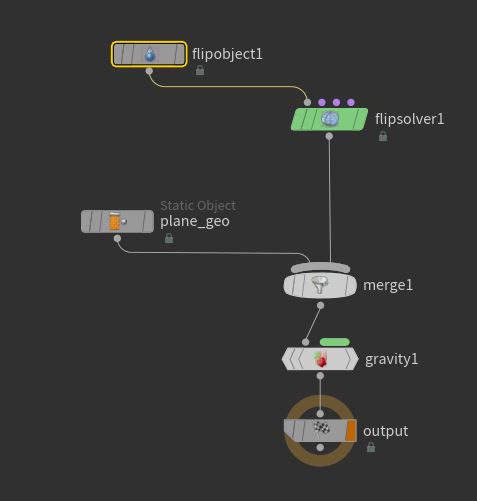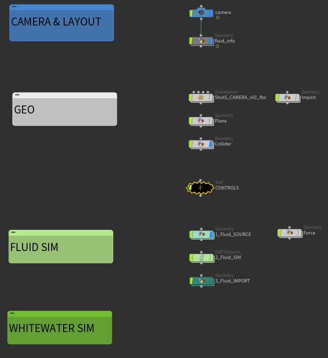 I’ve fixed and finalised the animation of the aircraft. From Maya, I exported the Camera FBX and the animation Alembic, then imported them into Houdini. I’ve been setting up the Houdini scene by timeshifting the animation frames from 0-240 to 1000-1240, making some basic controls for the FLIP fluid simulation. I also added some info on the screen to make it easier when I test out settings for my sims. So here’s what I have: