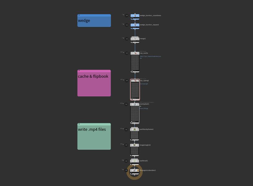 I read up on Houdini TOPs from CGwiki’s and managed to set up some wedges, a ropfetch node for caching, an opengl to write out flipbook frames, partition-by-frame, imagemagick, and ffmpeg to write out .mp4 files.